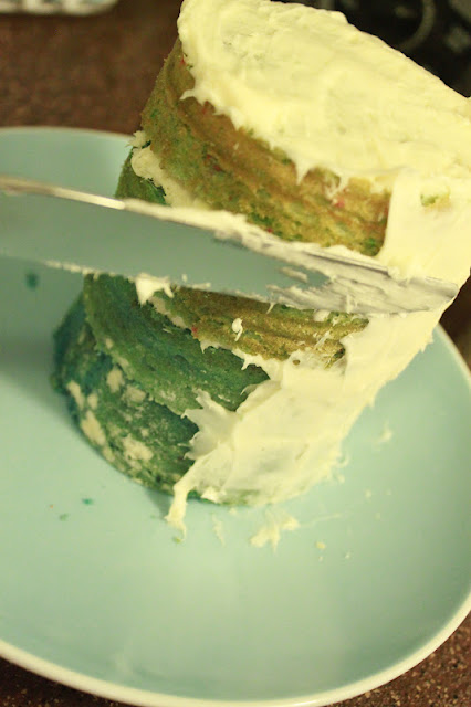 So, I thought I would cut them in half and make 2 cakes. Boo yah! One I wanted to keep open, no icing on the sides, only between the layers.